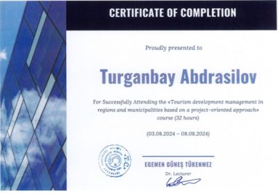 Іс-сапар барысында жоба орындаушылары Алания университетінің Туризм факультетінің PhD, аға оқытушы Егемен Гүнеш Түкенмезтің «Аймақтар мен муниципалитеттерде туризмді жобалық тәсіл негізінде дамыту менеджменті» атты 32 сағаттық курсынан жоба жетекшісі және орындаушылары өтті.