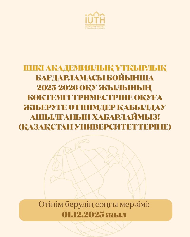 Ішкі академиялық ұтқырлық бағдарламасы бойынша 2025-2026 оқу жылының көктемгі триместріне оқуға жіберуге өтінімдер қабылдау ашылғанын хабарлаймыз! (Қазақстан университеттеріне)