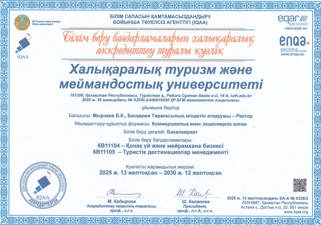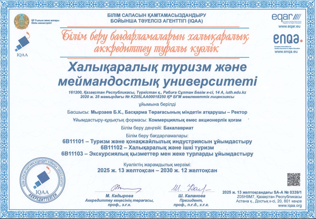 Университет басшылығы Халықаралық туризм және меймандостық университетін Халықаралық бағдарламалық аккредиттеуден сәтті өтуімен құттықтайды және ұжымға алдағы уақытта нәтижелі еңбек, жаңа жетістіктер тілейді!