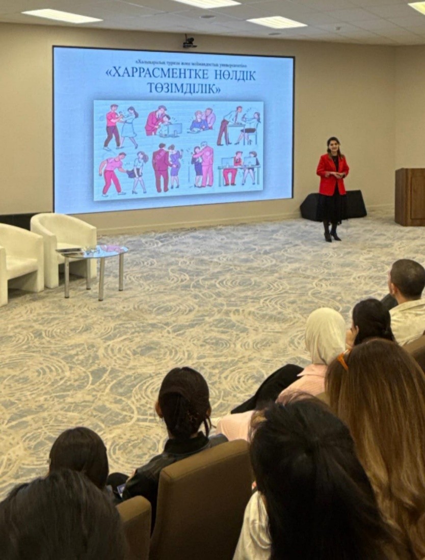 Университет білім алушылары үшін «Харассментке мүлдем төзбеушілік» атты маңызды тәрбие іс-шарасы ұйымдастырылды. Кездесудің негізгі мақсаты — білім алушыларға харассмент ұғымын түсіндіру, оның түрлері мен салдары туралы ақпарат беру, сондай-ақ мұндай жағдайлардың алдын алу жолдарын қарастыру. Іс-шараны Әлеуметтік-мәдени даму бөлімі мен психолог Д.С. Эрметова ұйымдастырды.