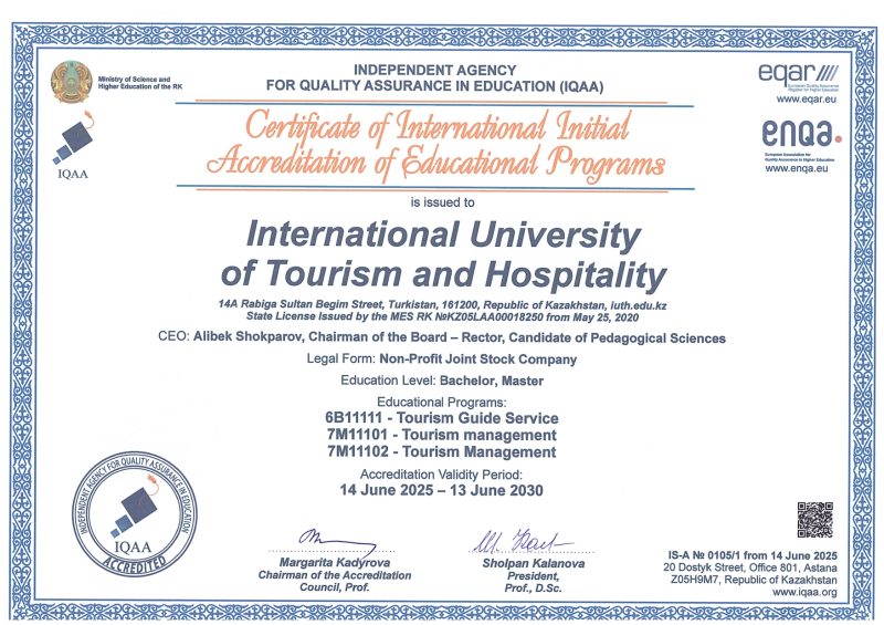 As part of the initial Program Accreditation of educational programs of the NJC “International University of Tourism and Hospitality,” a visit by the External Expert Group of the National University “Independent Agency for Quality Assurance in Education” (IQAA) took place from May 12 to May 13, 2025. Following the meeting of the Accreditation Council held on June 14, 2025, a decision was made to accredit the educational programs of the NJC “International University of Tourism and Hospitality” for a period of 5 years.