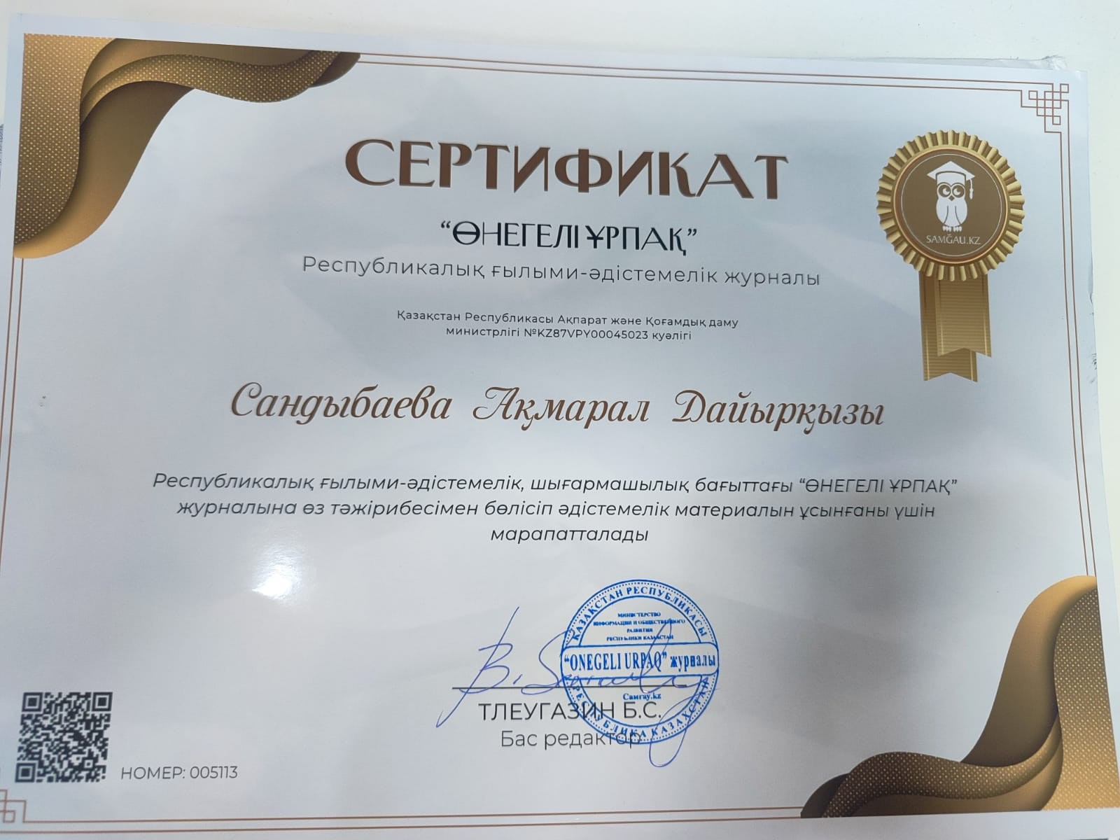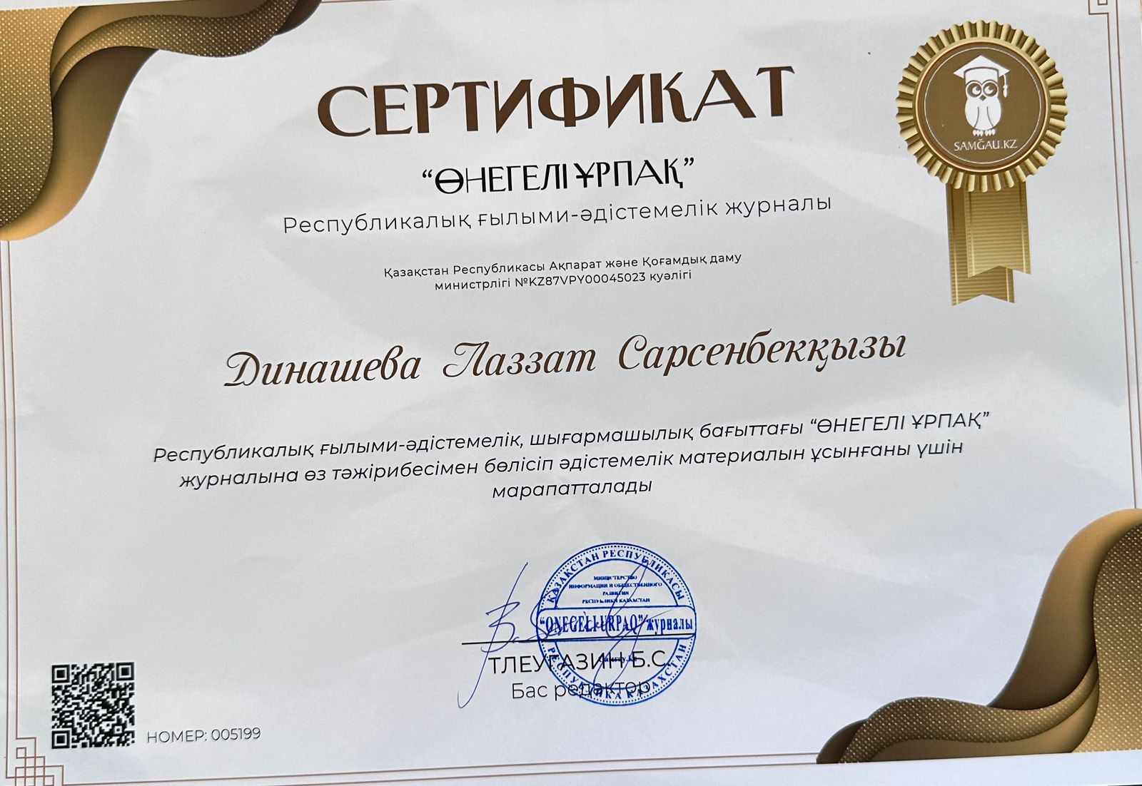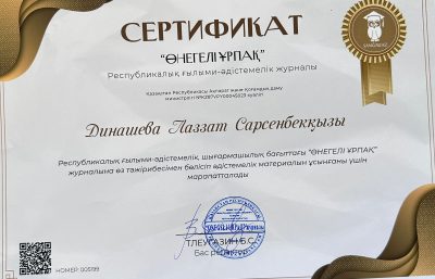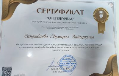 Raya Onalbaykyzy, a Senior Lecturer at the School of Humanities, published a scientific article in the national republic scientific-methodical journal “Onegeli Urpaq” (No. 2(03)-2026).