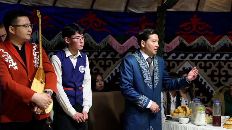 Специально прибывшую делегацию встретили в юрте Международного университета туризма и гостеприимства. На торжественном праздновании присутствовали аким Туркестанской области Дархан Сатыбалды, заместитель акима Туркестанской области Бейсен Тажибаев, ректор университета Алибек Шокпаров, а также и другие представители интеллигенции.